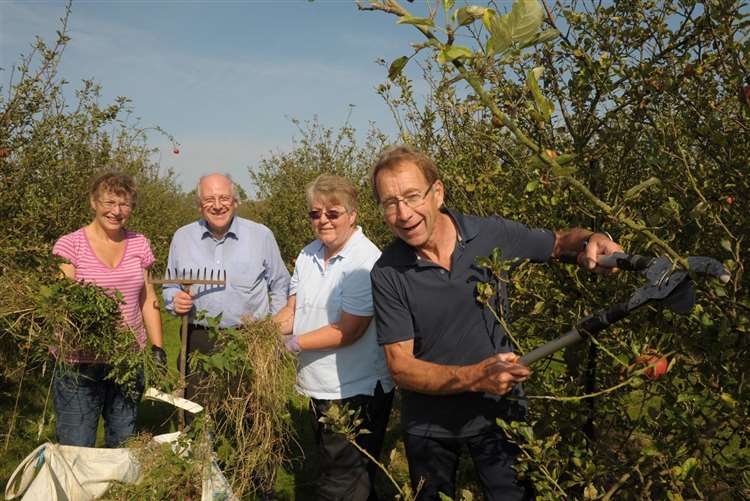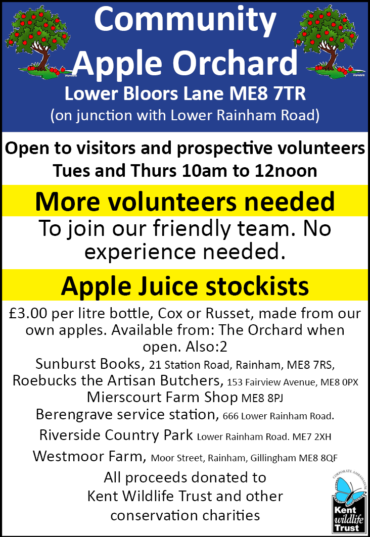 In July 2014 KWT Corporate Ambassador Hamish Mackay Miller, Publisher of The Net Magazine, recruited a band of volunteers to rescue five acres of overgrown apple orchard in Lower Rainham. They took advice from Marion Turner and John Bennett of KWT who came to a site meeting with the owner, Jimmy Zammit, an advertiser in The Net. Agreement was reached that the volunteers would run it both as a productive orchard and for the benefit of wildlife. Mr Zammit offered the land rent free with any profit made from the sale of apples to be donated to KWT. The volunteers set about clearing the head high nettles and thistles to give access to the fruit. Although a poor crop “Pick Your Own” days that year raised enough to pay the necessary public and employer’s liability insurances.
