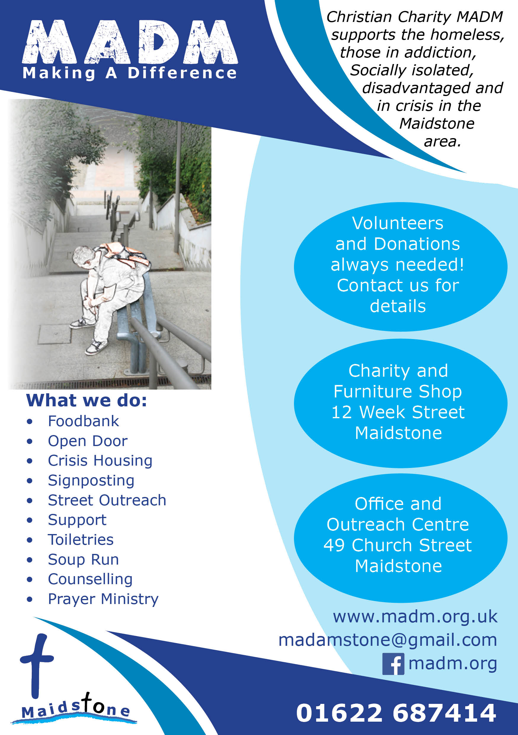 MADM is a Christian charity based in Maidstone supporting the homeless, those in addiction, socially isolated, disadvantaged and in crisis.