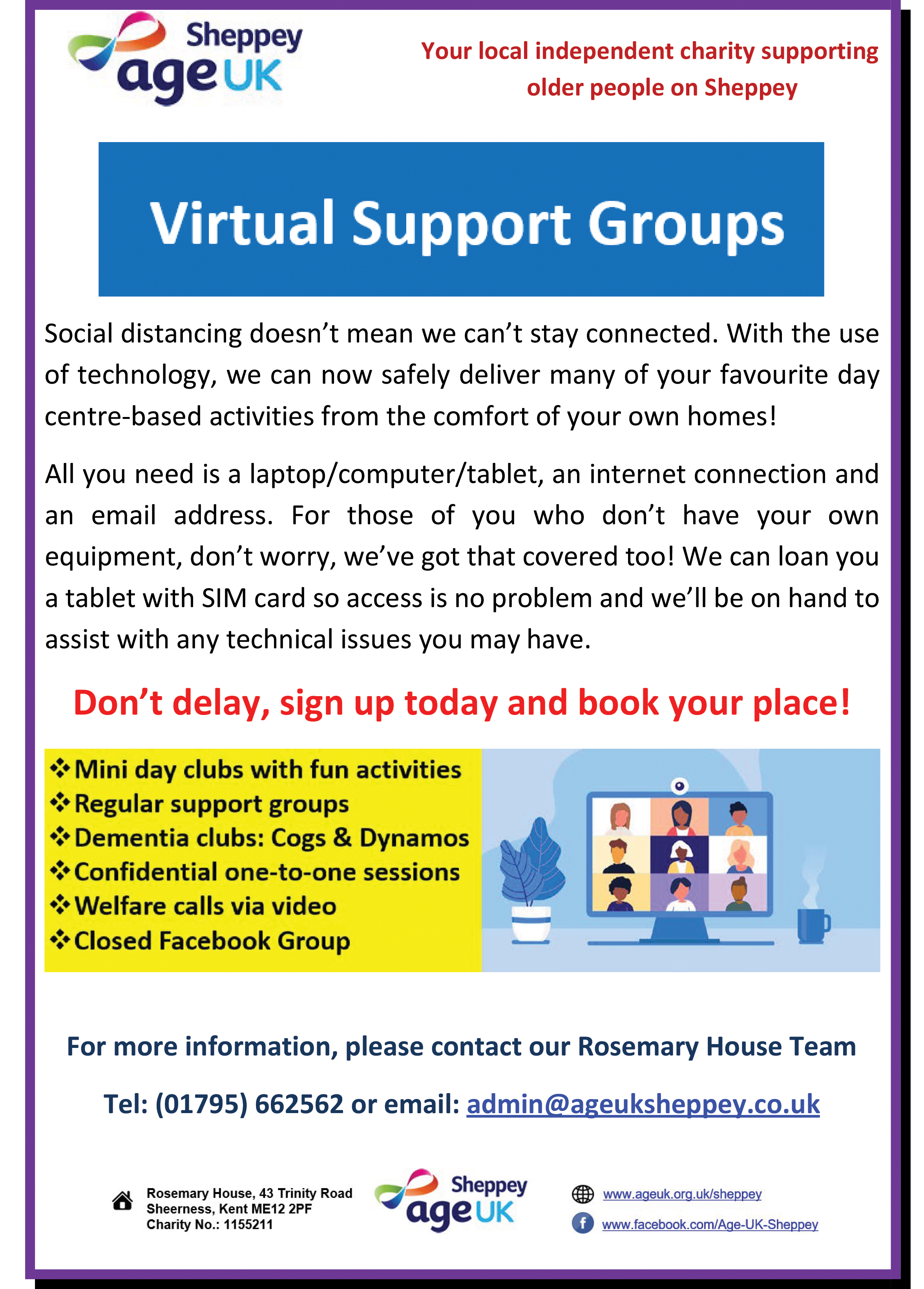 Age UK Sheppey offer a wide range of services including Home Support, free Information and Advice, Day Club in Sheerness Dementia Support, Freshly cooked meals delivered to your home, Equipment Hire, Befriending, Foot Care, Hearing Aid Clinic and Battery Exchange, Escorted Trips, Regular Events and Activities and Computer Training. Call us on (01795) 662562 to find out more. Volunteers are needed to assist in a wide variety of roles at our two day clubs. Please call (01795) 662562 or email admin@ageuksheppey.co.uk for an application pack.